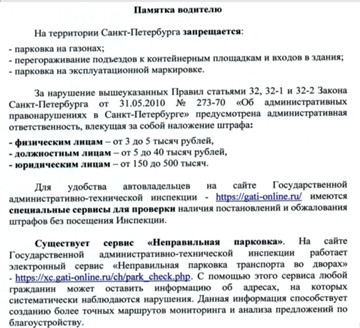 В соответствии с Правилами благоустройства территории Санкт-Петербурга, утвержденными постановлением Правительства Санкт-Петербурга от 09.11.2016 № 961 (далее - Правила), не допускается размещение транспортных средств на территориях зеленых насаждений общего пользования, зеленых насаждений, выполняющих специальные функции, зеленых насаждений ограниченного пользования, газонах, на территориях детских, спортивных площадок, площадок для выгула и дрессировки животных, вне пределов дорог на внутриквартальной территории, повлекшее перегораживание подъездов к площадкам для сбора отходов, размещение транспортных средств вне пределов дорог на внутриквартальной территории, повлекшее перегораживание внутриквартальных проездов, пешеходных дорожек, проходов к зданиям и входов в них, а также на эксплуатационной маркировке.